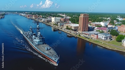 © Ben Kuang, Naklejka premium Historic battleship sailing along a calm riverfront under a clear blue sky.