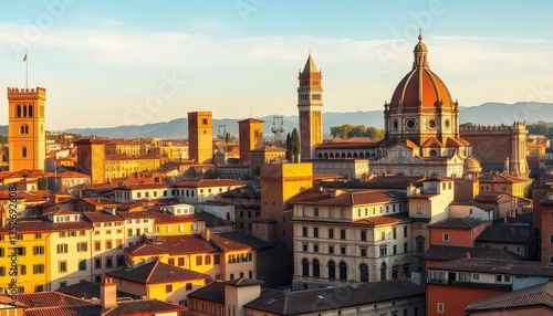 Fototapeta premium Historic Bologna towers and architecture, sunlit cityscape, Two Towers of Bologna, towers of Bologna