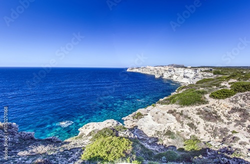 Fototapeta premium Historic Bonifacio on Corsica’s dramatic limestone cliffs against a clear blue Mediterranean sea and sky