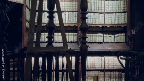 Fototapeta premium Historic book stacks and wooden balusters in shallow defocus, interior;...