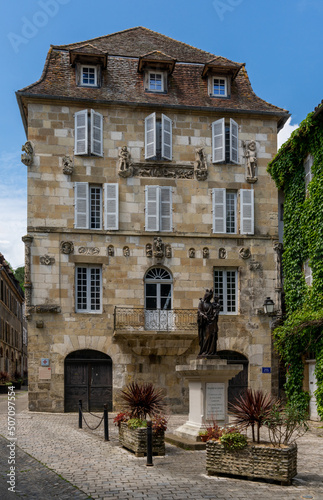 Fototapeta premium historic Bourgeoisie building and statue in the fortified town center of Beaulieu-sur-Dordogne