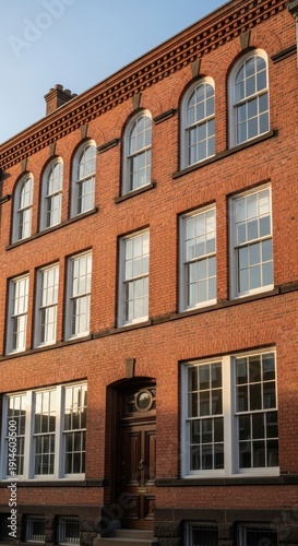 © Aisa, Fototapeta premium Historic Brick Building Facade in Urban Setting with Arched Windows.