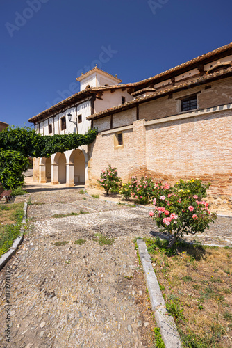Obraz premium Historic building arches at Plaza Mayor, Viloria de Rioja, Spain