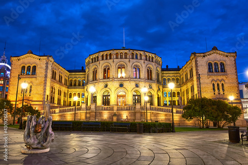 © Oleksandr Dibrova, Fototapeta premium Historic building of Norwegian Parliament at dusk