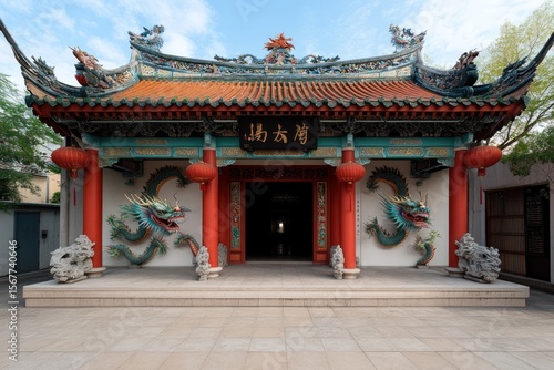Naklejka premium Historic Chinese Temple Roof with Colorful Dragon Sculptures