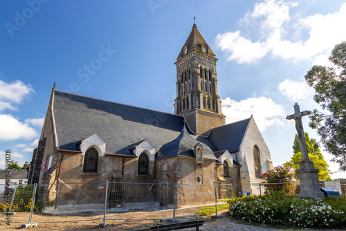 Fototapeta premium Historic church building featuring a bell tower and stone calvary under a...