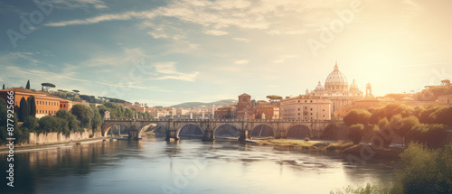 © evening_tao, Obraz premium Historic Cityscape with River at Sunset