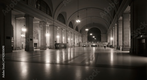 Fototapeta premium Historic empty train station interior with arched ceilings and tall columns at night