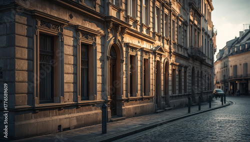 © janzwolinski, Fototapeta premium Historic European architecture bathed in warm sunlight on a cobblestone street