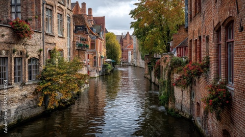 © Kitta Studio, Fototapeta premium Historic European Canal with Old Brick Buildings and Lush Greenery