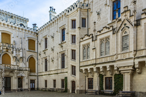 Obraz premium Historic european castle courtyard with gothic architecture and stone facades
