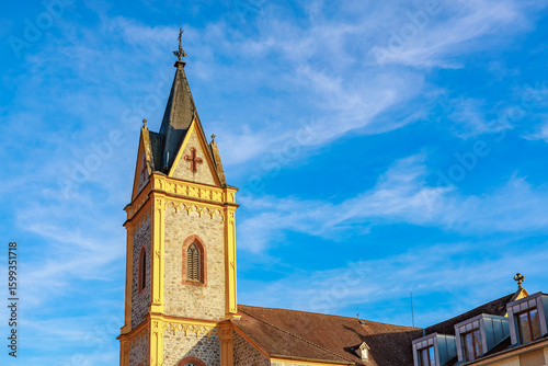 © Iurii Gagarin, Fototapeta premium Historic european church tower against blue sky