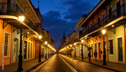 Naklejka premium Historic French Quarter street illuminated at night, urban tranquility
