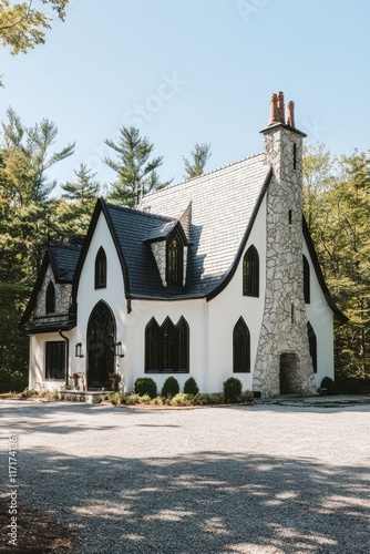 © gamespirit, Fototapeta premium Historic gothic-style chapel surrounded by trees in a tranquil rural setting, showcasing intricate architecture and charming details in bright daylight