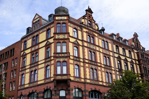 Fototapeta premium Historic Gründerzeit building in the old town of Hannover, Germany, with ornate facade, arched windows, and vibrant architectural details.