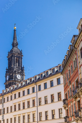 Fototapeta premium Historic houses and tower of the Dreikonigskirche church in Dresden, Germany