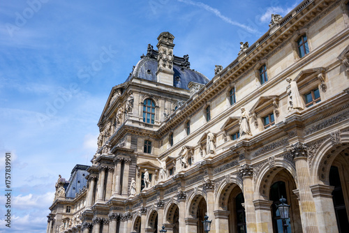 © Viola, Fototapeta premium Historic Louvre building with detailed architecture and blue sky editorial use only