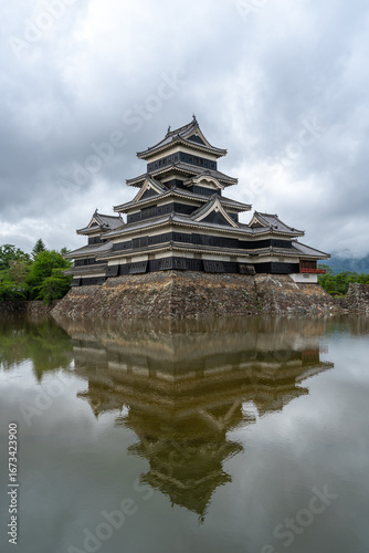 Fototapeta premium Historic Matsumoto Castle reflected in calm waters, Japan