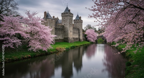 © Deamard, Naklejka premium Historic medieval castle beside river with pink cherry blossoms.