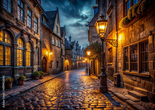 Fototapeta premium Historic old town street at night, dimly lit by vintage streetlights, with...