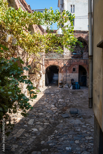 Fototapeta premium Historic Ottoman caravanserai inn courtyard with stone arches and workshops...