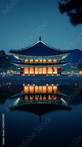 © Bijali, Fototapeta premium Historic palace seoul with water reflection night lights image