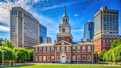 Naklejka premium Historic Philadelphia landmarks like Independence Hall and Liberty Bell stood proudly against a bright blue sky on a sunny summer day in Pennsylvania.