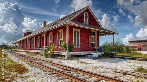 © Ramzan, Obraz premium historic railway station with Bahama shutters in classic railroad red, adding character to the functional structure