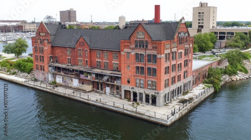 © Chronicles Artsy , Naklejka premium Historic Red Brick Building on the Waterfront with Urban Backdrop and Industrial Charm