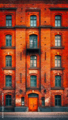 © Daria, Obraz premium Historic red brick building with vibrant orange door and classic windows