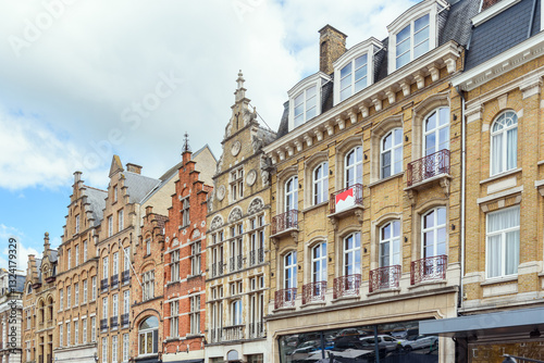 © alpegor, Fototapeta premium Historic residential buildings with shops on ground level in Belgium on a partly cloudy summer day