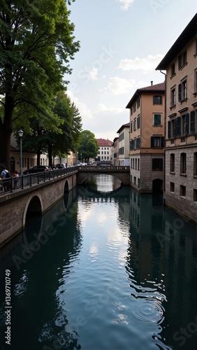 © Julia, Fototapeta premium Historic River Walk in Switzerland Bern showcases beautiful architecture along calm water. Concept of Historic River Walk in Switzerland Bern emphasizes serene landscape, reflecting tranquility.