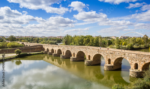 © venemama, Fototapeta premium Historic roman bridge (Puente Romana) over the Guadiana river in Merida, Spain