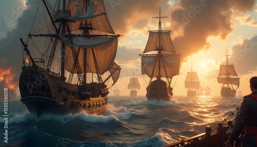 Fototapeta premium Historic sailing ships at sunset during naval expedition