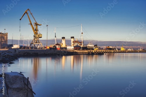 Fototapeta premium Historic Ships and Crane at Tallinn Seaplane Harbour at Sunrise