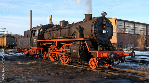 © Nadiyah, Naklejka premium Historic steam locomotive at railway depot, winter sunlight, industrial background; ideal for transportation, history, or industrial themes