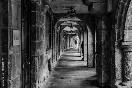 © mariano, Fototapeta premium Historic Stone Arcade Corridor in Black and White