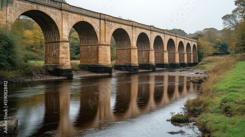 © Patria, Fototapeta premium Historic Stone Arch Bridge Reflecting in Calm Waters Surrounded by Lush Greenery and Autumn Tr