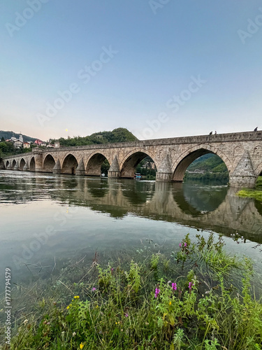 © Kufotos, Fototapeta premium Historic stone bridge with illuminated arches over the Drina River at dusk.