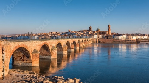 © Watcharaporn, Obraz premium Historic stone bridge with multiple arches spanning a calm river in a scenic ancient cityscape under a clear blue sky