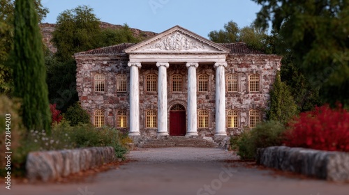 Naklejka premium Historic stone building with classical columns and a vibrant red door,...
