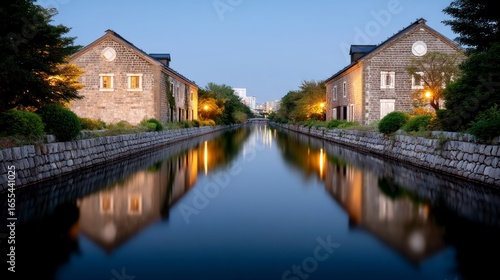 © BOJOShop, Fototapeta premium Historic stone buildings line a calm canal reflecting evening lights under a clear twilight sky