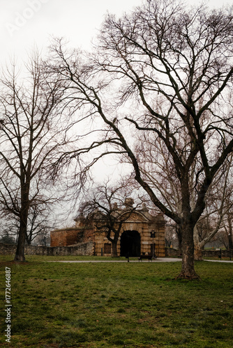 Naklejka premium Historic stone gate surrounded by tall bare trees in a park on a cloudy winter day