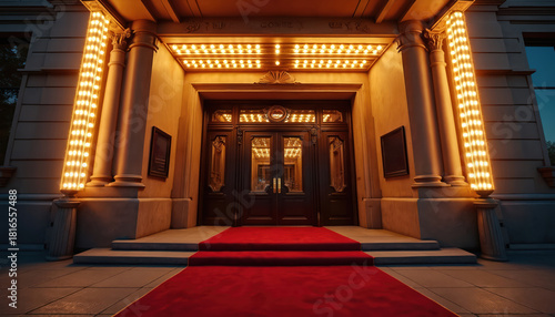 © Pete, Obraz premium Historic theater entrance illuminates at night. Long red carpet extends towards grand ornate wooden doors, classic stone columns. Bright marquee lights adorn building facade. Prestigious cinema