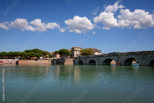 Fototapeta premium Historic Tiberius Bridge, ancient Roman architecture, Rimini landmark, built...