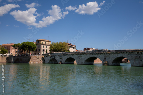 Naklejka premium Historic Tiberius Bridge, ancient Roman architecture, Rimini landmark, built...