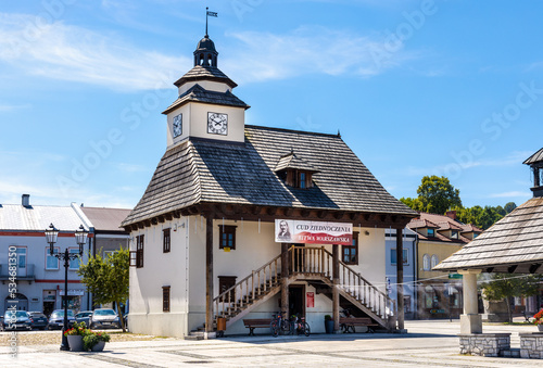 © Art Media Factory, Fototapeta premium Historic Town Hall Ratusz Miejski and renewed wooden well at Rynek Main Market square in old town quarter of Pilica in Silesia region of Poland