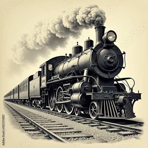 © Crazy Stock – Studio, Naklejka premium Historic train on tracks, detailed engraving in vintage style for wall art.