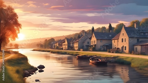 © laraib, Fototapeta premium Historic village beside the river at sunset. Generative AI picture