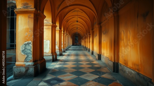 Fototapeta premium "Historical Arched Corridor with Ornate Columns and Checkered Floor"